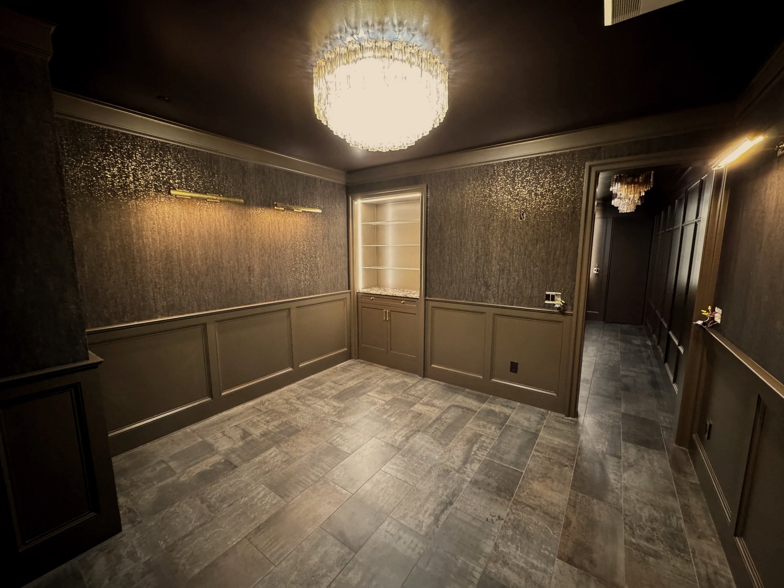 Wrapped in rich chocolate tones, this lounge unfolds as a hidden retreat, complete with concealed passageways, a discreet bar, and layered, glimmering lights.